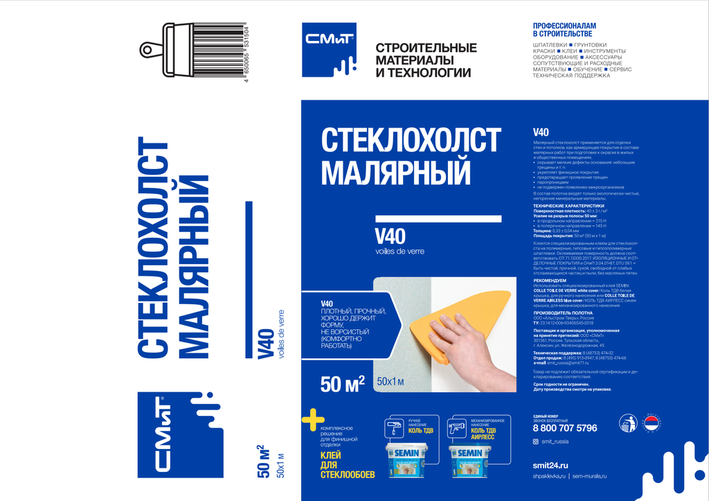 Стеклохолст СМиТ V40 Стеклохолст малярный плотностью 40 г/м2 (50м x 1м)